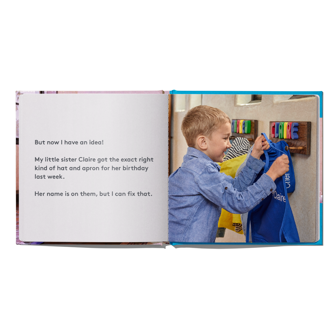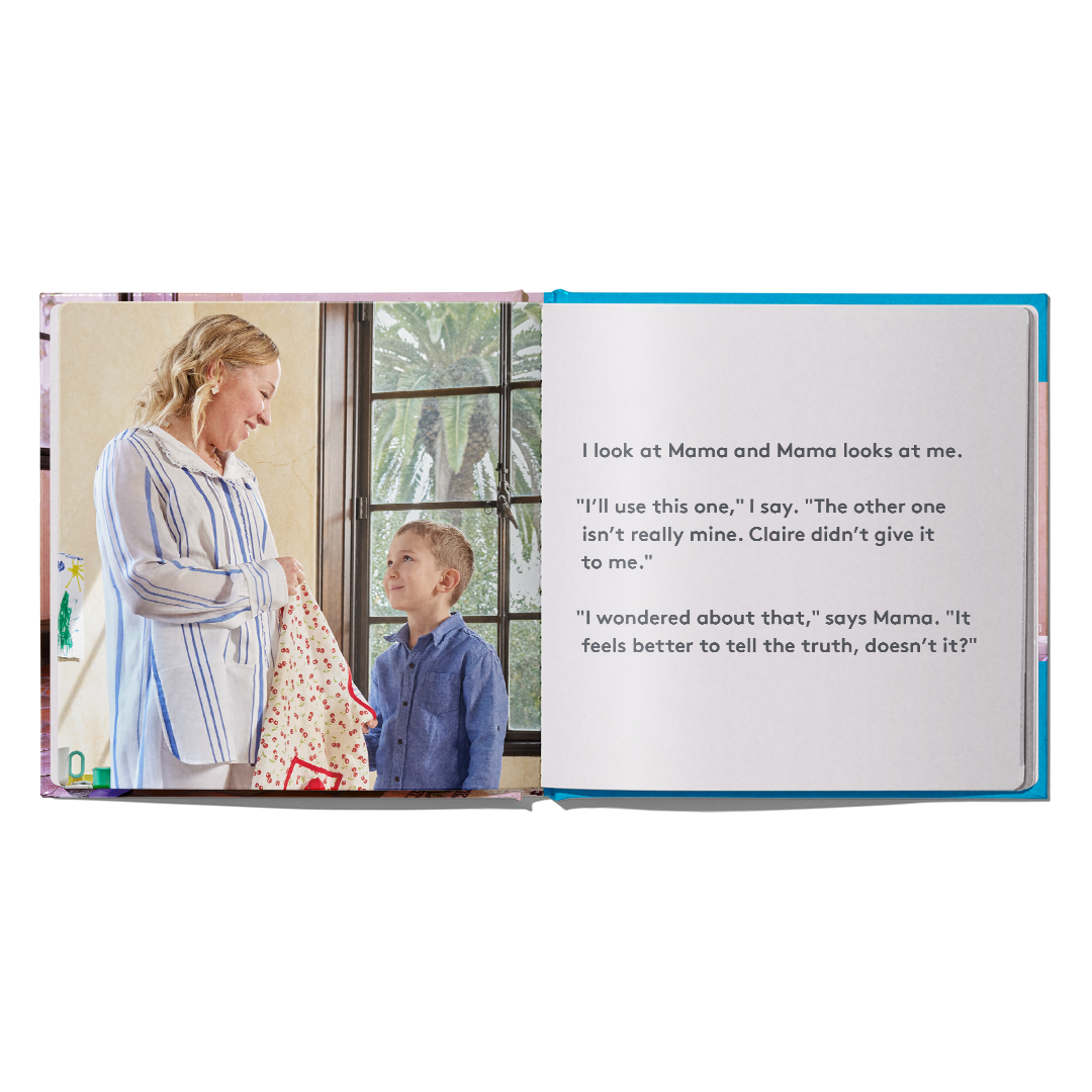 ‘I Told a Lie’ features real photos and a relatable story of Andrew taking his sister’s hat and apron without asking. When confronted, he has a big decision to make – lie or tell the truth.